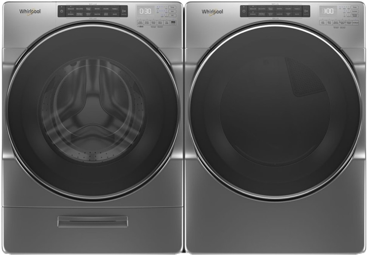 Whirlpool® Chrome Shadow Front Load Laundry Pair with a 4.5 cu. ft. capacity front load washer and a 7.4 cu. ft. capacity front load electric dryer.Read More